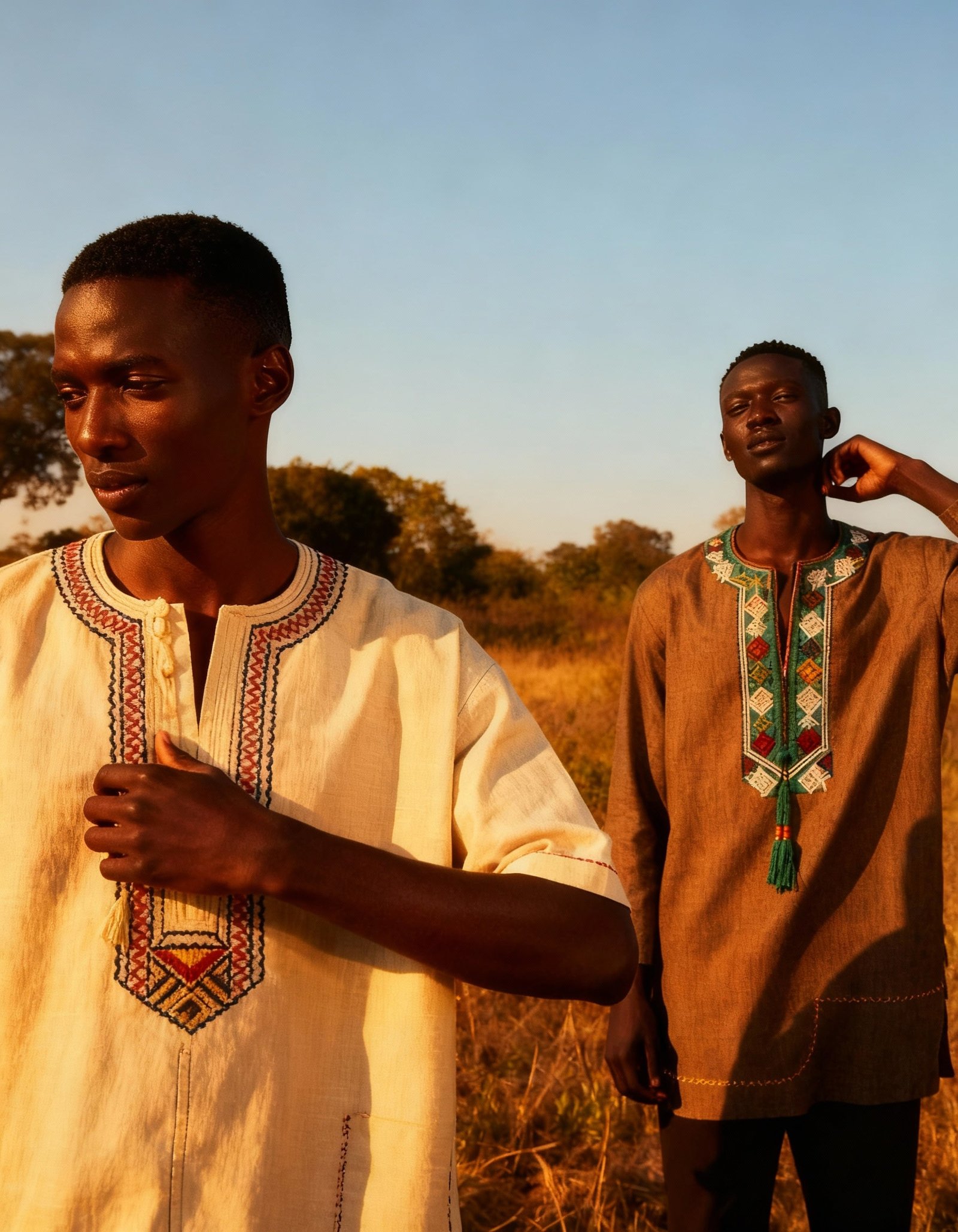 Limited-edition pieces with Nzema embroidery and woven trims — wearable storytelling.